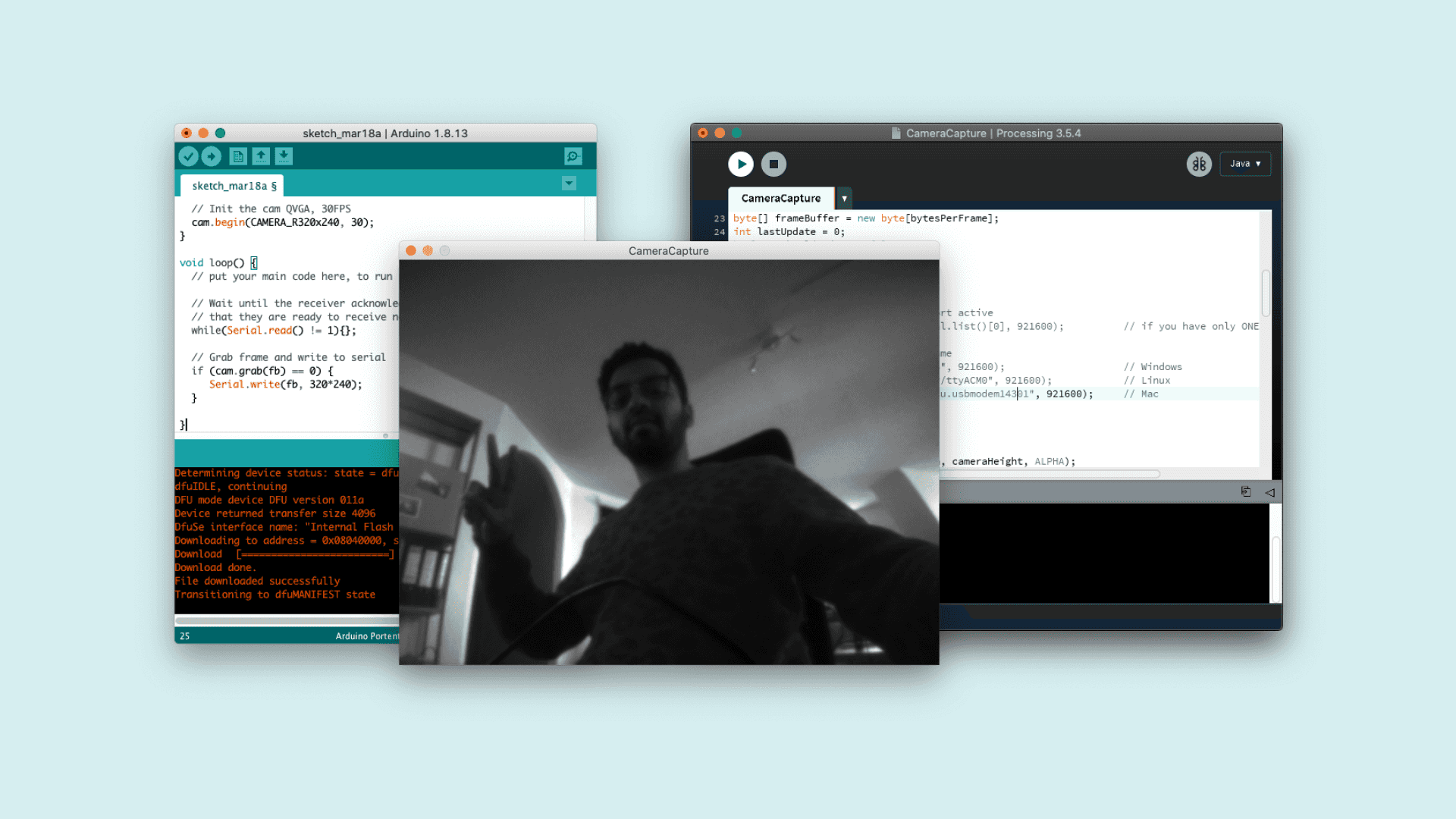 In the loop you need to capture each Frame and send it over a serial connection to the Processing sketch that will display the frames. You will use the